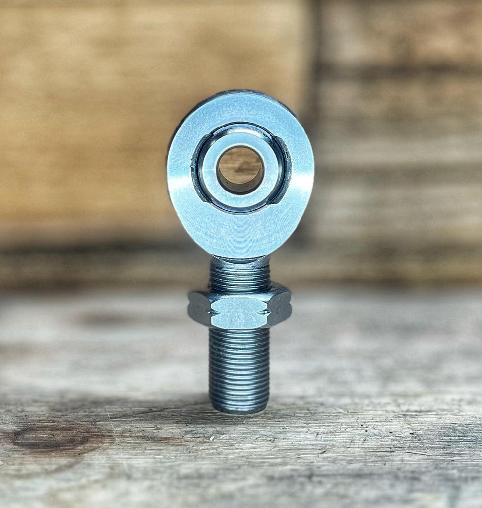 Heavy-duty 4130 chromoly steel, heat-treated, hard-chrome plated body, 52100 bearing steel ball, nylon/PTFE self-lubricating race. Used for 4-link, suspension, and steering setups.